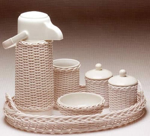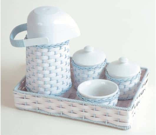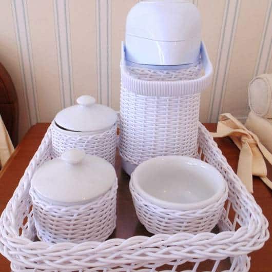 O kit simples é composto por dois potinhos com tampa; molhadeira; garrafa térmica; lixeira e bandeja em vime.