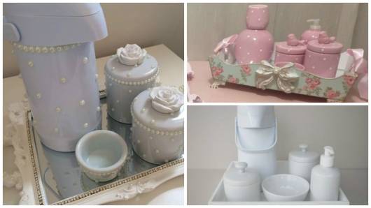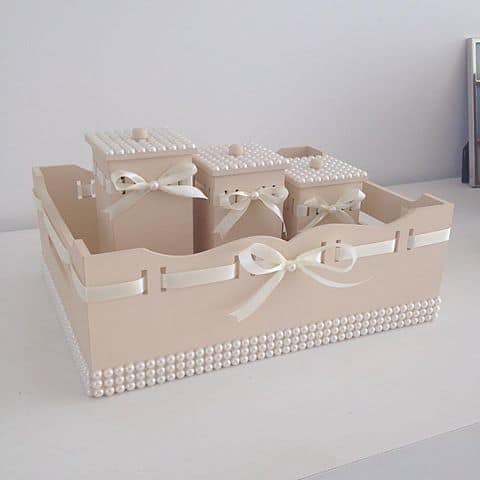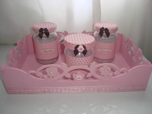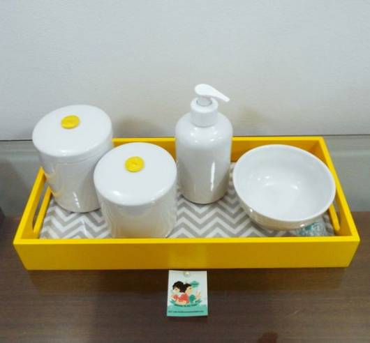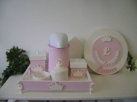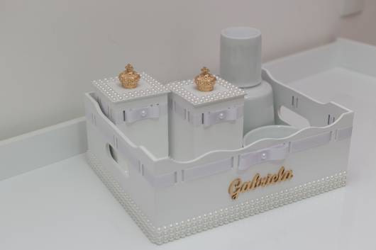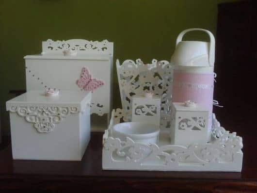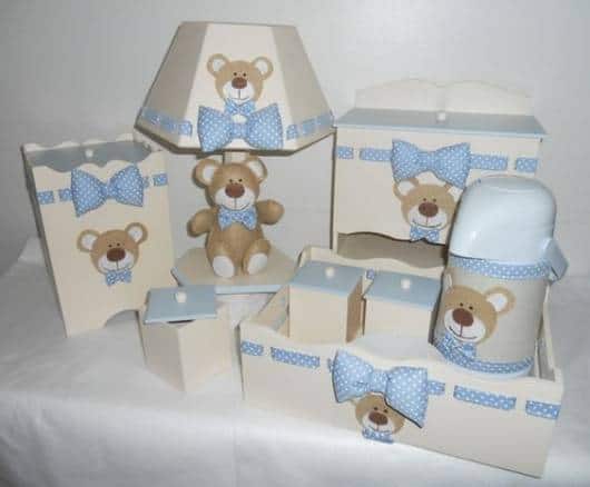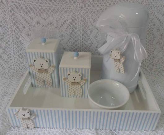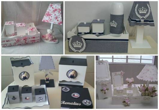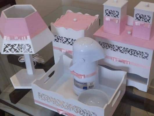 Quando a ideia é fazer um modelo em MDF, há diversas possibilidades de decorar as peças e montar o kit, já é só comprar os itens separados e ir montando o conjunto de higiene do baby.