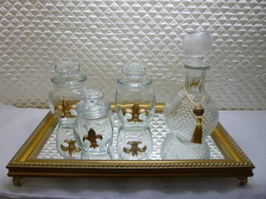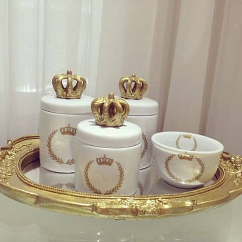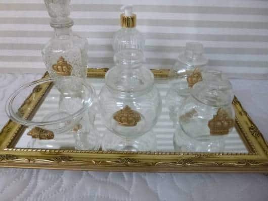 Os itens de vidro foram decorados com coroas douradas