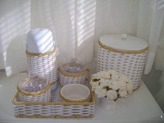 Um modelo de decoração clássica para o kit higiene é o revestimento com vime em volta das peças. E neste modelo a ideia é de uma composição neutra, onde o vime é um mix de branco e bege.