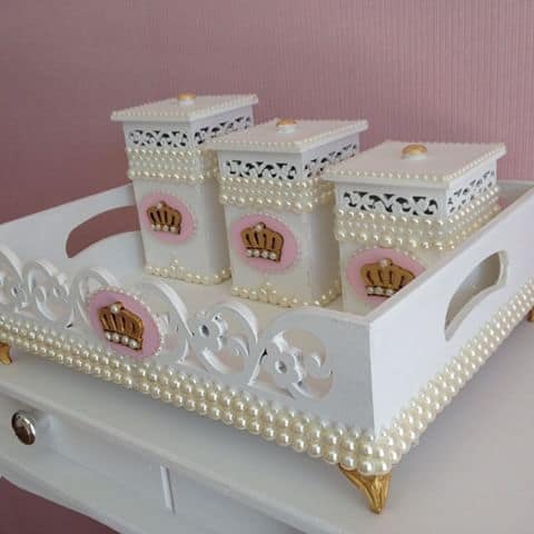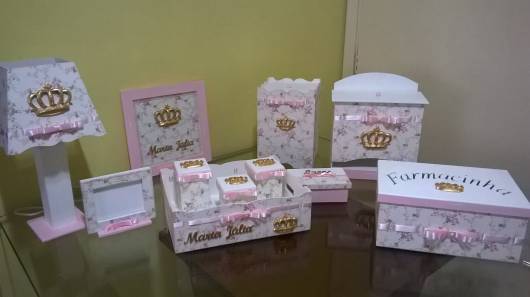 No modelo, as peças de MDF foram pintadas de branco e decoradas com pérolas e pequenas coroas douradas, que trazem o tema de princesas para a decoração.