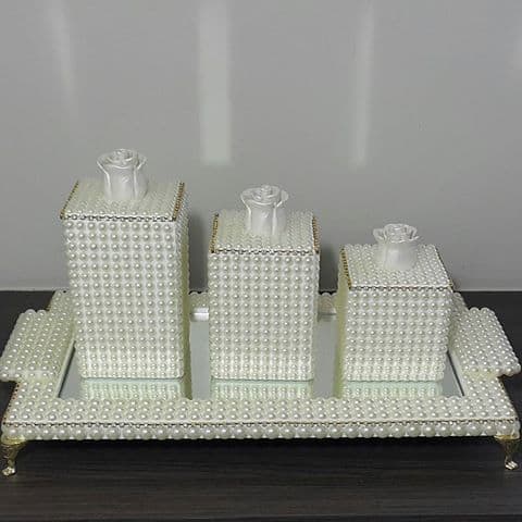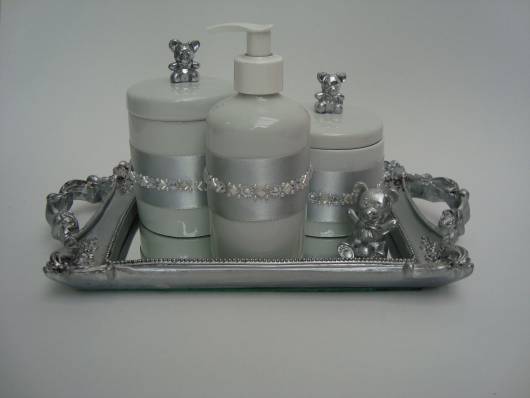 Se a ideia é escolher um modelo de kit higiene bebê que seja delicado e traga sofisticação para a decoração, os modelo decorados com pérolas são perfeitos.