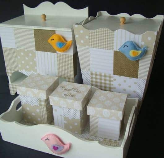 Além do revestimento de tecido, o kit ainda ganhou o detalhe de passarinhos de feltro que trazem a temática de pássaros para a decoração e dão um charme especial ao kit.