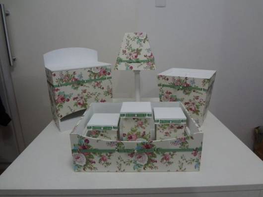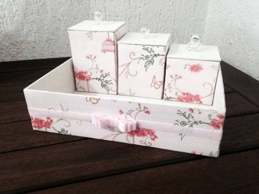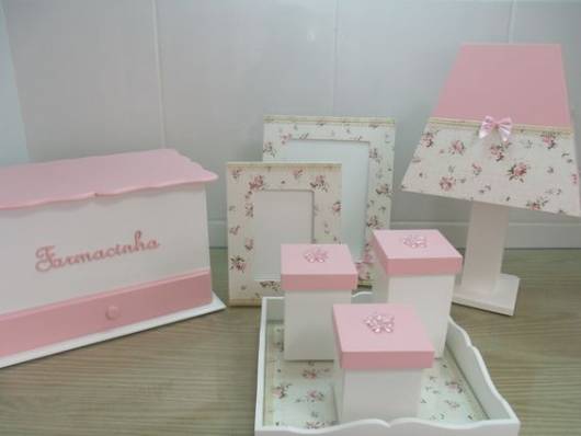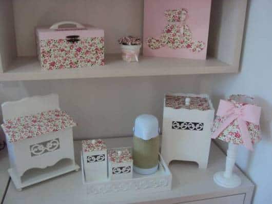 Aqui as peças de MDF foram pintadas de branco e rosa e decoradas com tecido delicado e floral.