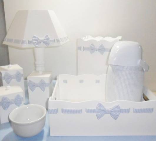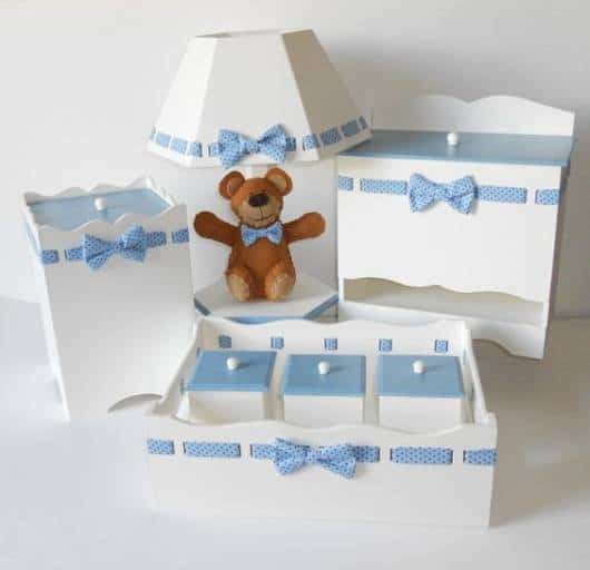 Nesta proposta, a ideia foi de pintar as peças de MDF de branco e inserir detalhes, como fitas, em azul. Esses detalhes trazem um pouco de cor ao kit e ficam lindos para decorar o quarto de bebê azul e branco.