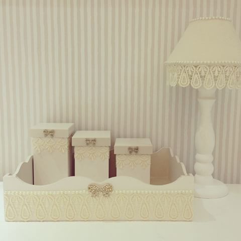 Nesta proposta, a ideia foi de pintar o fundo de rosa e cobrir as peças com renda também rosa, que manteve o kit em uma cor única, mas com delicadeza e charme.