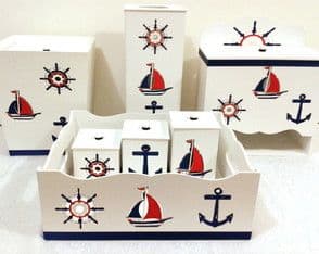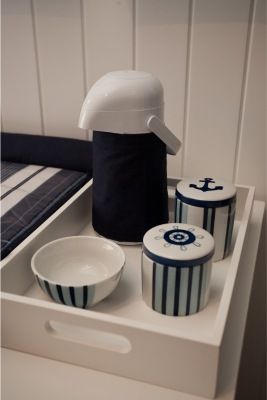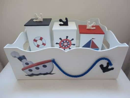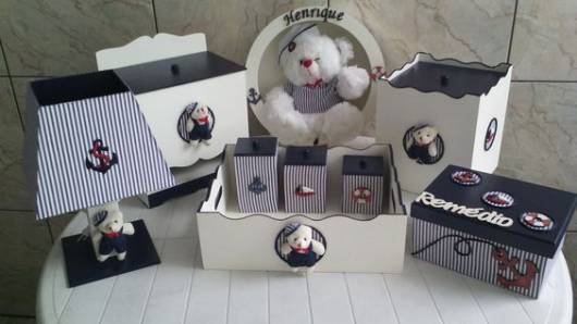 No kit, as peças foram revestidas com tecido de listras azul e branco, e elementos que remetem ao tema náutico completam a decoração, como boias, timão, âncora e ursinho marinheiro.