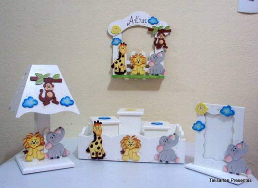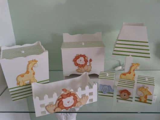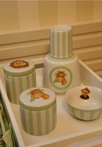 Se a ideia é manter a decoração do quarto de bebê safari, os potinhos e itens que compõem o kit também devem seguir a temática.