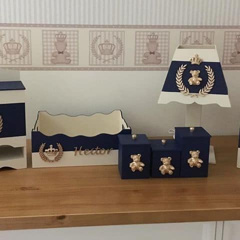 Nesta proposta, as peças são um mix de azul marinho e dourado, e a aplicação de ursinhos nas peças mantém a temática da decoração até nos detalhes, como os potinhos do kit higiene.