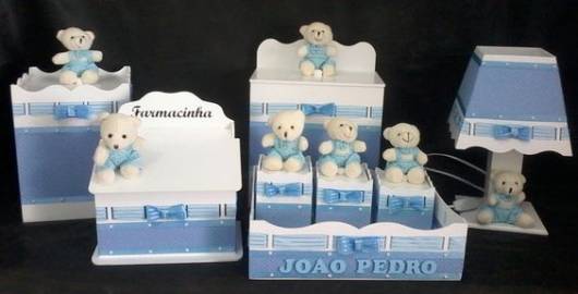 O tema de ursinhos também pode ser inspiração para decorar o quarto de bebê e ainda enfeitar as peças do kit higiene.