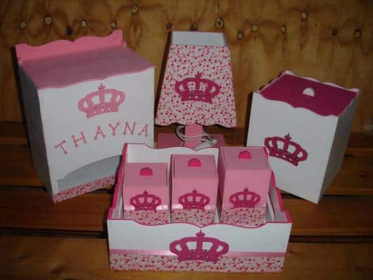 A temática de princesa pode ser retratada através de coroas que decoram o kit, como é o caso desta proposta.