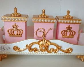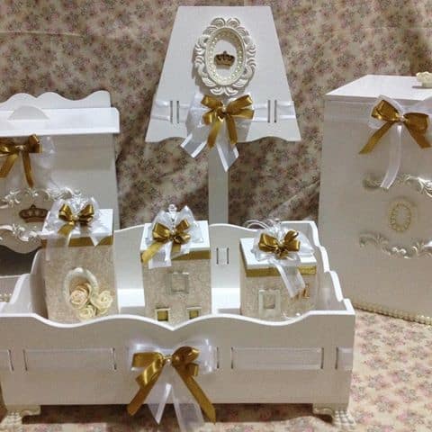 Nesta opção as peças são em MDF e foram decoradas com pérolas e tiras de strass, que trazem um pouquinho mais de brilho para o kit e mantendo a elegância do conjunto que vai decorar o quartinho do bebê.