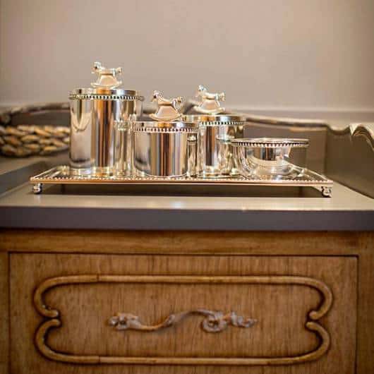 Se a ideia é apostar em um modelo de kit higiene bebê mais elegante e que um toque de brilho para a decoração do quartinho, não tenha medo de escolher tons metálicos como prata e dourado para as peças.