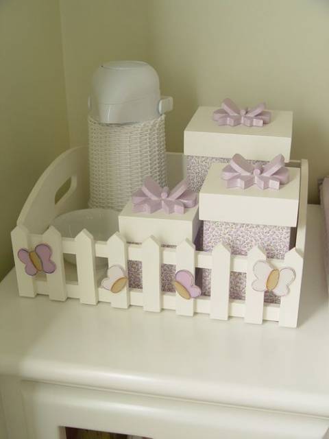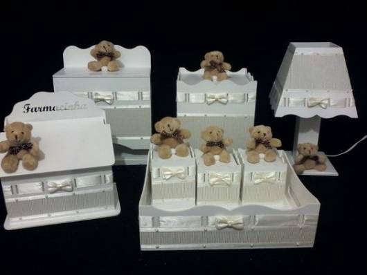 Os modelos de kit higiene bebê também podem ser decorados com tecido, como nesta proposta em que as peças de MDF foram pintadas de branco e decoradas com tecidos em tons de bege e branco.