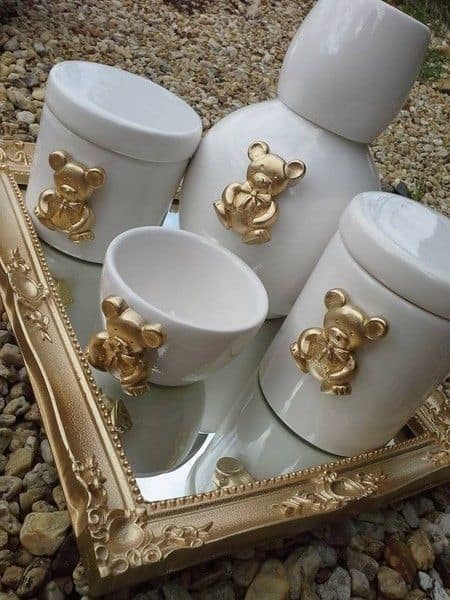 Neste modelo de kit higiene bebê, a ideia foi de usar peças de cerâmica branca e decorá-las com ursinhos dourados. Para a bandeja, a aposta foi por usar um espelho com moldura dourada.