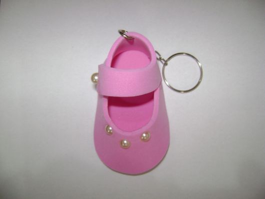 O sapatinho foi feito em EVA rosa e decorado com algumas pérolas, o que deixa o item mais delicado. O item ainda ganhou a argola de chaveiro, o que torna o sapatinho uma opção de lembrancinha.