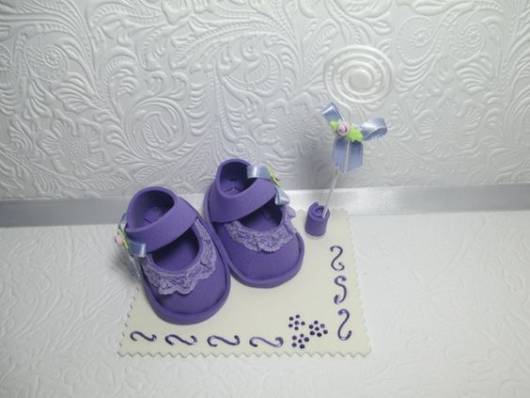 O sapatinho tradicional também pode ser substituído por uma sandália de bebê, como este modelo em lilás e branco. O item além de lindo é uma graça para a decoração do chá de bebê de menina.