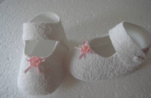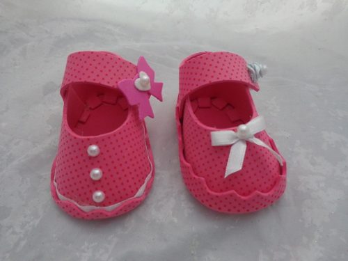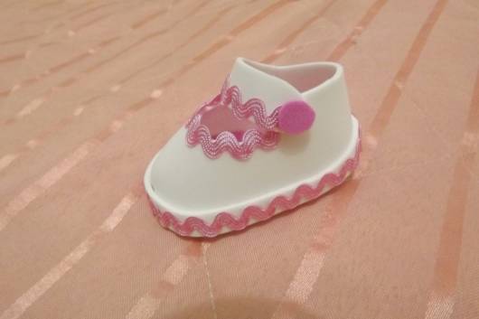 Neste caso, a ideia foi de usar a base do sapatinho branca e para trazer um toque de cor, o mix com detalhes em rosa foi a aposta. Entre os detalhes do sapatinho, foi usada sianinha e feltro (botão) para decorar.