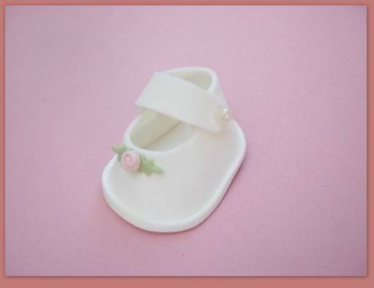 Para deixar a decoração neutra, vale usar o sapatinho predominantemente na cor branca. O único detalhe que adiciona um pouquinho de cor é a flor de biscuit, mas que traz tons suaves.