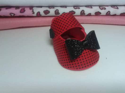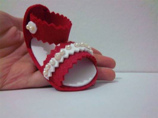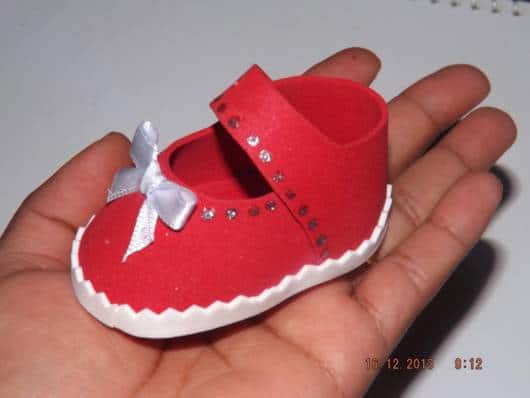 Se a proposta é fazer uma decoração em vermelho para o chá de bebê, o sapatinho de EVA também pode seguir essa cor, como nesta proposta.
