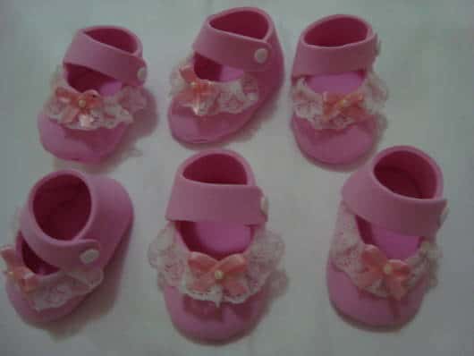 O aviamento de renda também é uma das ideias para decorar o sapatinho de chá de bebê. Aqui a cor rosa foi definida para o o item, e a renda em um tom de rosa mais claro decora o sapatinho, dando destaque e delicadeza ao item.