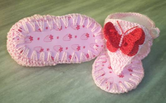 O EVA rosa com bolinhas marrom foi usado para fazer a sandália
