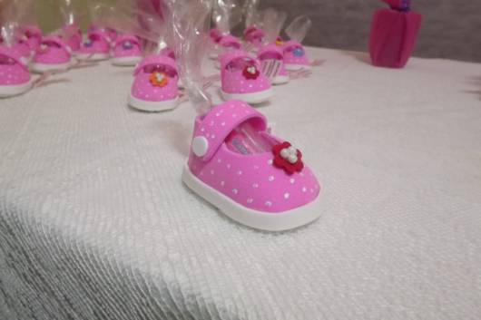 Outra ideia de lembrancinha para o chá de bebê ou chá de fraldas, é esse modelo de sapatinho rosa decorado com aviamento em forma de flores brancas. O mimo ganhou um saquinho cheio de confeitos de chocolate e foi usado como lembrancinha da comemoração.
