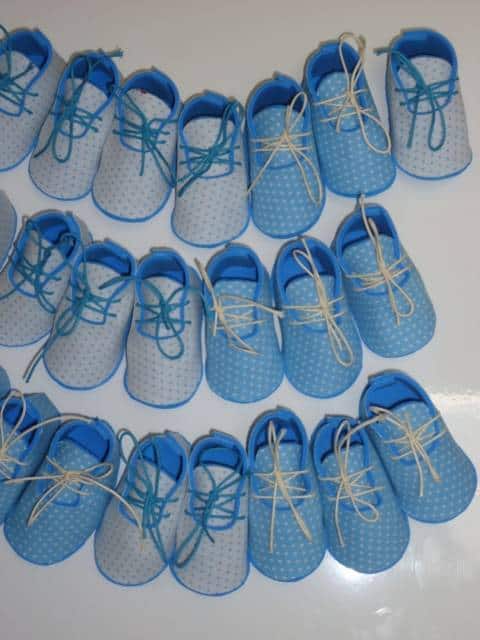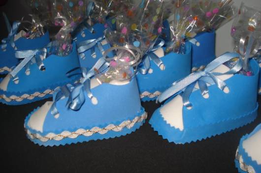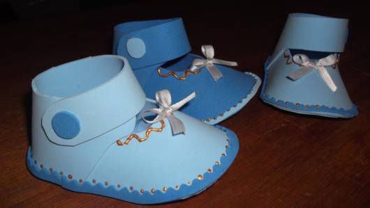 Para o chá de bebê azul o sapatinho feito de EVA pode seguir os tons da festa, e a inspiração aqui foi de fazer o sapatinho em dois tons de azul.