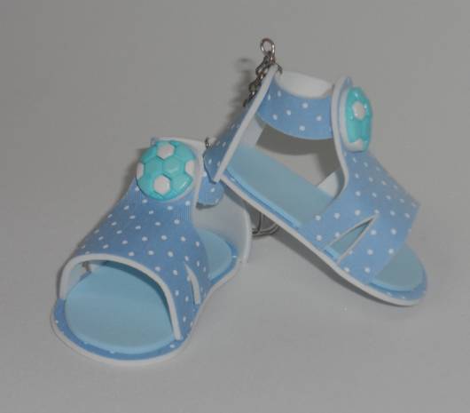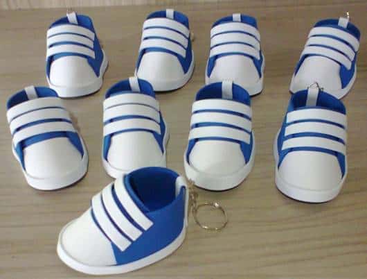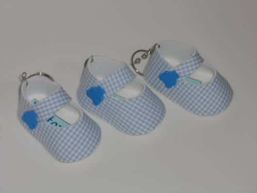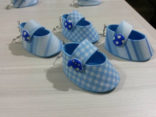 Se você está precisando de ideias para a lembrancinha de chá de bebê de menino, aposte nos sapatinhos de EVA em forma de chaveiro.