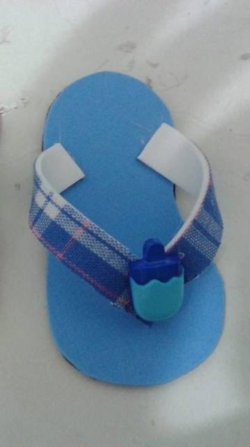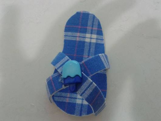 Seguindo a inspiração de usar o chinelinho, esse modelo é uma ideia. Aqui o chinelo foi feito em azul e o tecido xadrez foi usado sobre o EVA para fazer a tira do chinelo. O sapatinho ainda tem o detalhe do botão em forma de picolé que decora o item.