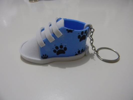 Nesta proposta, o sapato segue o estilo de tênis com cadarço, também feito de EVA, e a argola de chaveiro transforma o item em lembrancinha.