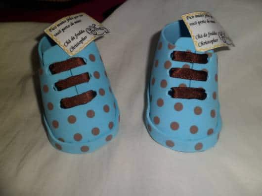 Entre as ideias para a decoração azul e marrom, o sapatinho segue o mesmo estilo e foi feito com EVA azul de estampa de bolinhas marrom. Para combinar, o cadarço de fita de cetim marrom foi a escolha.