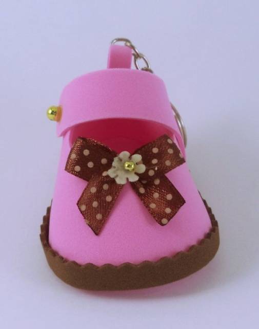 Na decoração de chá de bebê rosa e marrom, até as lembrancinhas podem seguir a cartela de cores e uma das propostas é fazer o chaveiro de sapatinho de EVA.
