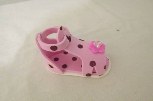 Neste caso, o mix de EVA rosa e marrom compõem o sapatinho e o lacinho  com estampa de bolinhas complementa a ideia na combinação de cores.