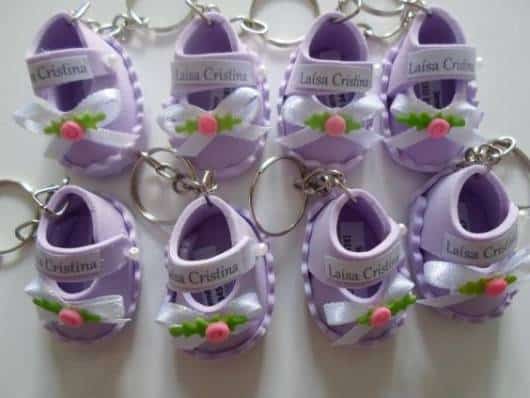 E entre as ideias simples de lembrancinhas, fica essa proposta de fazer um chaveiro de sapatinho de EVA. Aqui o item foi feito de EVA lilás  e na alça do sapatinho há o nome da bebê que está a caminho.