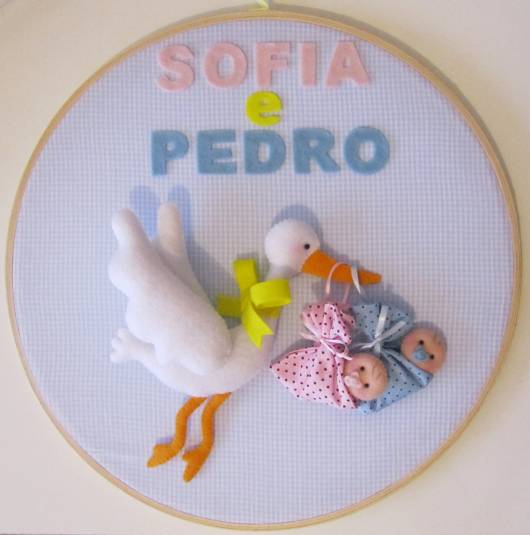 Para o casal de gêmeos que chegou, a proposta foi de usar um enfeite no bastidor. A decoração de cegonha carregando os bebês é uma graça, e o quadrinho ainda tem os nomes dos irmãos.