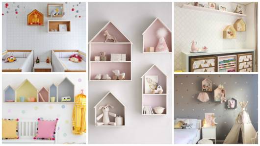 Ao invés dos tradicionais formatos de nichos, que costumam ser redondos ou quadrados, o formato de casinha é a nova proposta para decorar o quarto infantil, e essa forma é coringa tanto para a decoração de quarto de menina, quanto para o quarto masculino.