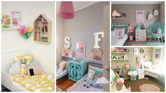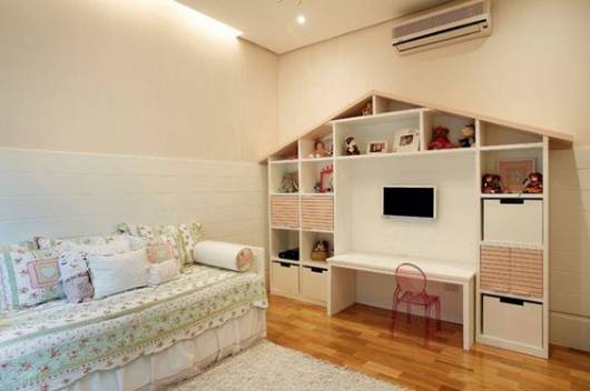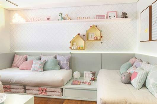 A ideia de usar esse tipo de nicho também pode se estender para o quarto compartilhado das irmãs pequenas; como é o caso deste projeto.