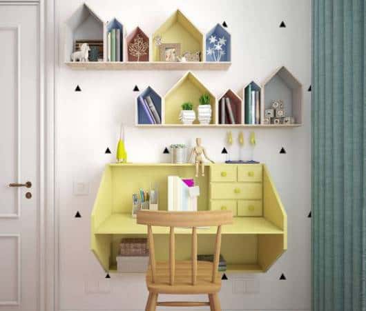 Entre as ideias de decorar o quarto infantil, nesta proposta os nichos em formato de casinhas foram usados em diferentes alturas na parede.