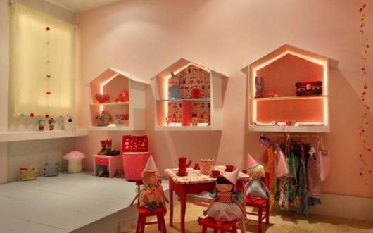Na proposta, os nichos com fundo rosa foram usados na parede e ganharam miniaturas de bonecas que os decoram.
