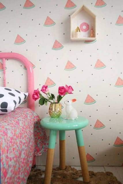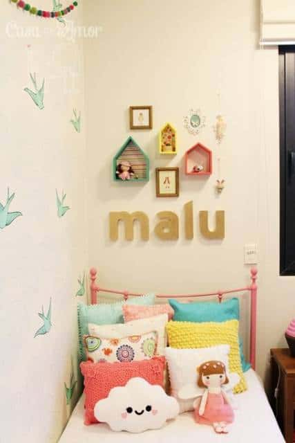 Em cada nicho, há uma cor de fundo diferente, mas todos ficam em harmonia com o quarto, e servem de apoio para itens decorativos e que dão um toque mais delicado na decor do quarto de menina.