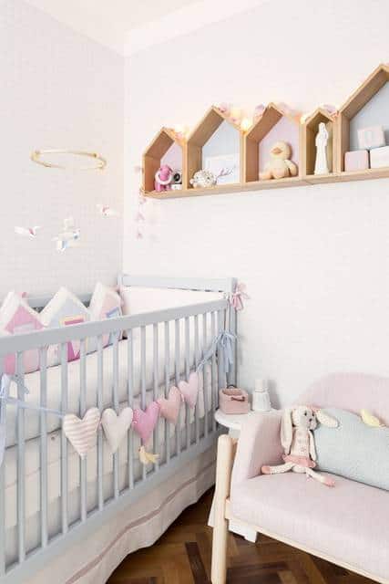 Na decoração do quarto de bebê as cores suaves são predominantes e para manter a decoração delicada, a aposta foi por usar nicho casinha na parede.
