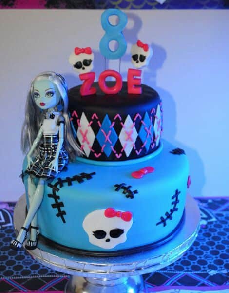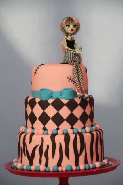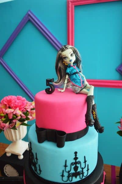 Se você está procurando um modelo de bolo Monster High de pasta americana que seja simples e bonito, essa inspiração é ótima. O doce foi decorado em rosa e azul e com detalhes em preto; e para manter a temática a aposta foi por usar uma boneca como parte da decoração. A escolha para a boneca foi a monstrinha Frankie Stein.