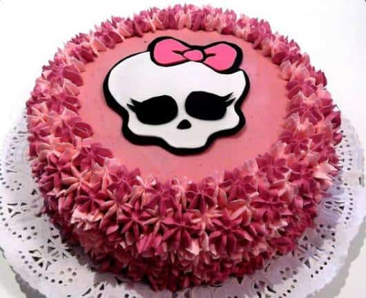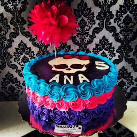 Se você está em busca de uma inspiração de bolo Monster High que seja decora com chantilly, uma das opções é esse modelo. Aqui o doce tem formato redondo e o topo decorado com a caveira símbolo do desenho. Para as laterais a aposta foi pela decoração com chantilly, que foi usado em três cores (roxo, rosa e azul) e confeitado em formato de flores, o que deixa o bolo ainda mais bonito.