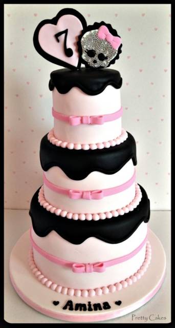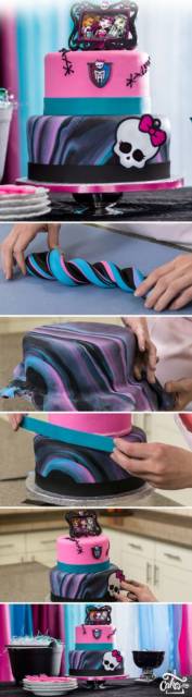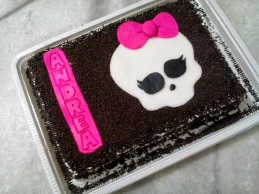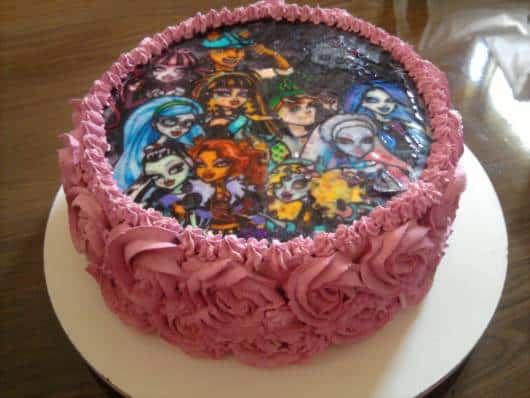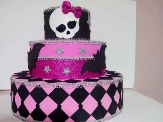 E se você quer um modelo que seja bem próximo da realidade, uma das opções é bolo de biscuit. A cobertura lembra muito pasta americana, e o doce parece de verdade. Para este modelo, a composição de cores foi feita em rosa, azul e preto, e detalhes do mundo Monster High decoram o doce.