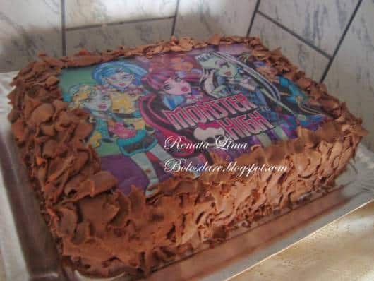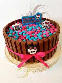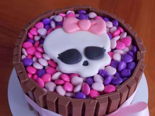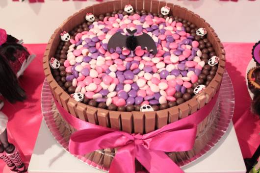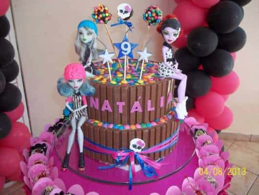 Se tem um sabor que faz sucesso entre as crianças, é o bolo de chocolate. E uma das variações desse tipo de bolo, é o bolo Kit Kat. Nesta inspiração, o bolo tem dois andares e as laterais foram feitas de Kit Kat. Na decoração, as bonecas Monster High decoram o doce e deixam clara a temática da festinha.