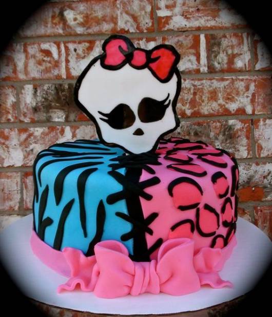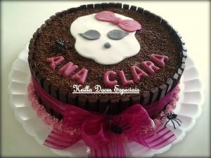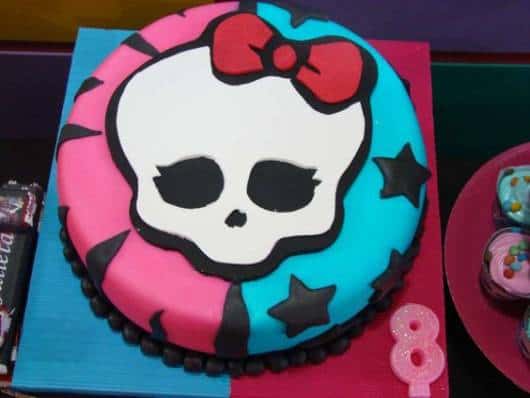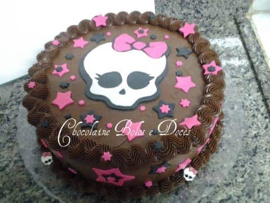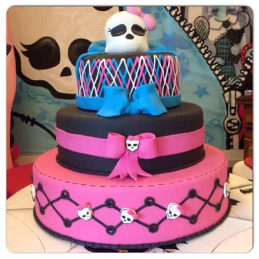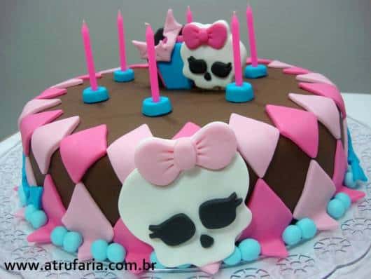 Outra opção para decorar o bolo de pasta americana é esse modelo. Aqui a cobertura foi feita com pasta americana de chocolate e a decoração é um mix de rosa e azul com elementos que remetem ao mundo Monster High, como as caveiras que decoram o bolo.